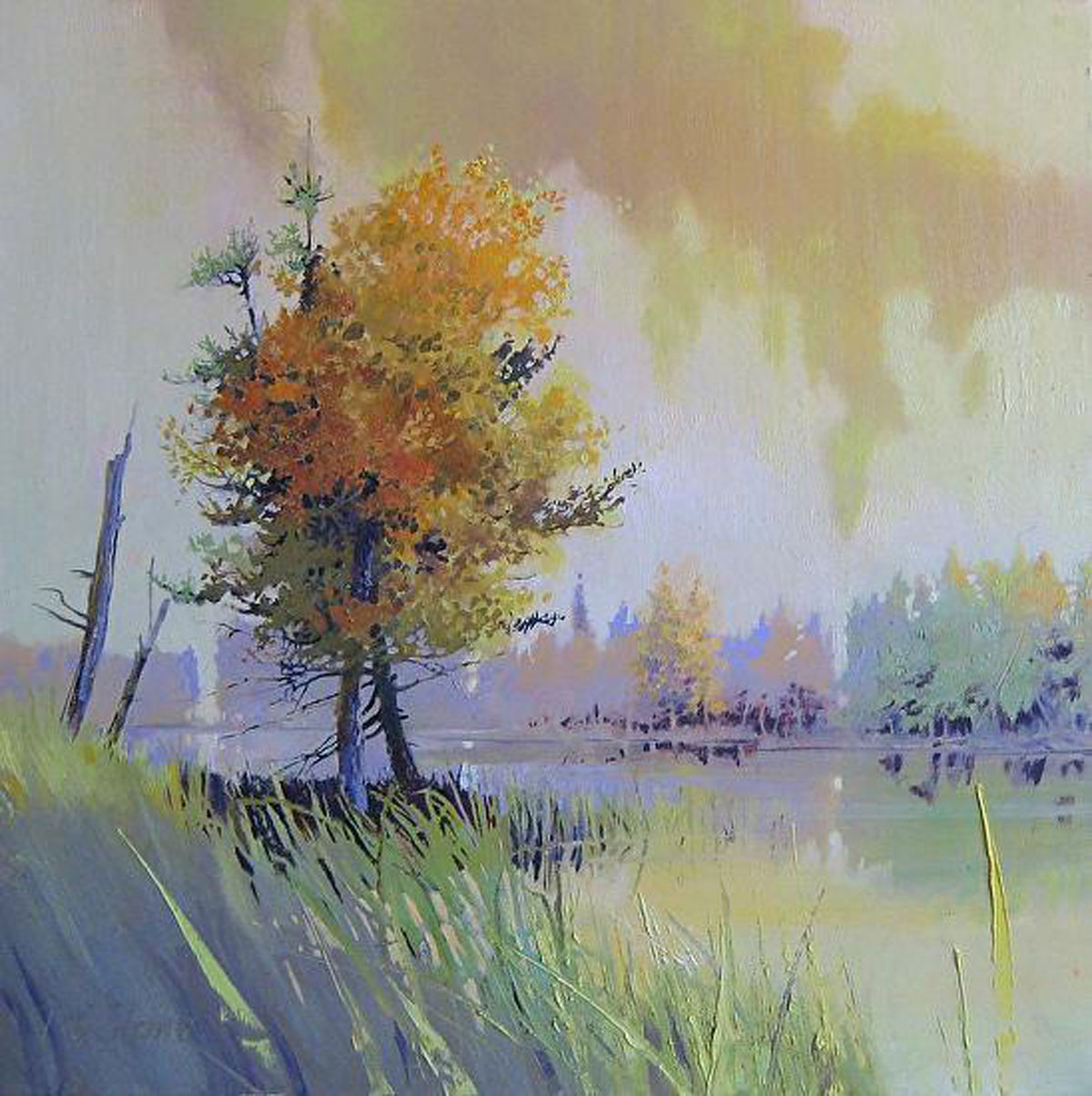 Upland Pond is a 27" x 27" oil on canvas by Paul Stone. This artwork is available at Vermont Fine Art Gallery in Stowe, Vermont.